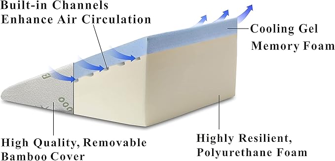 - Two Layer Design plus an adjustable Cooling Gel memory foam headrest pillow in one package: This latest version is made of 2-INCH Cooling Gel memory foam layer on top of a firm base foam, also adding a height-adjustable Cooling Gel memory foam headrest to provide better support for your neck and head. The end result is the most comfortable wedge pillow system on the market. U.S. Patented.