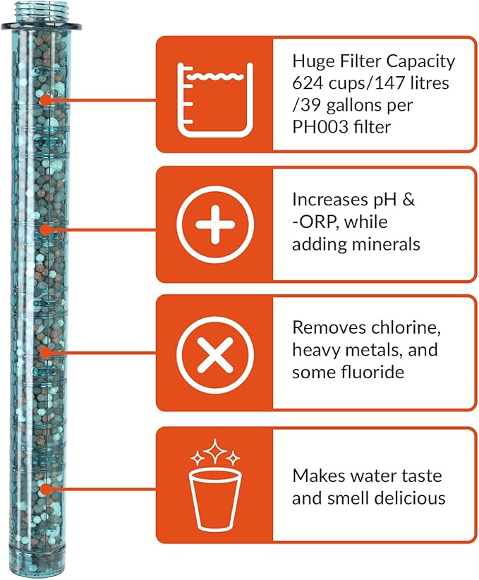 - Multi-Stage Alkaline Water Filter - increasing water pH and -ORP, improving taste and smell, adding minerals including zinc, magnesium, selenium & iron (PH003 replacement cartridges search (B07PX2QHPY)
