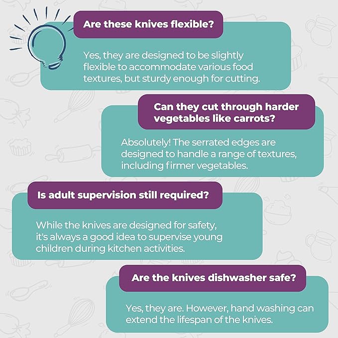 - Inspire Children To Cut Like Master Chefs With The #1 Safety Kitchen Knives! Give your children the opportunity to cut like master chefs with our #1 safety kitchen knives. These knives are designed to encourage active participation in meal preparation while ensuring safety and minimizing the risk of cuts or injuries. They have been meticulously tested and approved by both parents and professionals, earning the trust of families everywhere.
