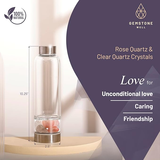 Crystal Water Bottle Elixir Set | Genuine Authentic Rose Quartz & Clear Quartz Healing Gemstones | Black Neoprene Sleeve | Drink Gem Infused Water