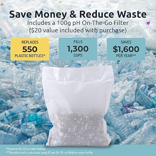 - LONG-LASTING FILTER CAPACITY - Each pH alkaline pitcher can filter up to 1.8L of water at a time, ideal for home & office. Its on-the-go filter pouch lasts up to 400L/105 gal of water.