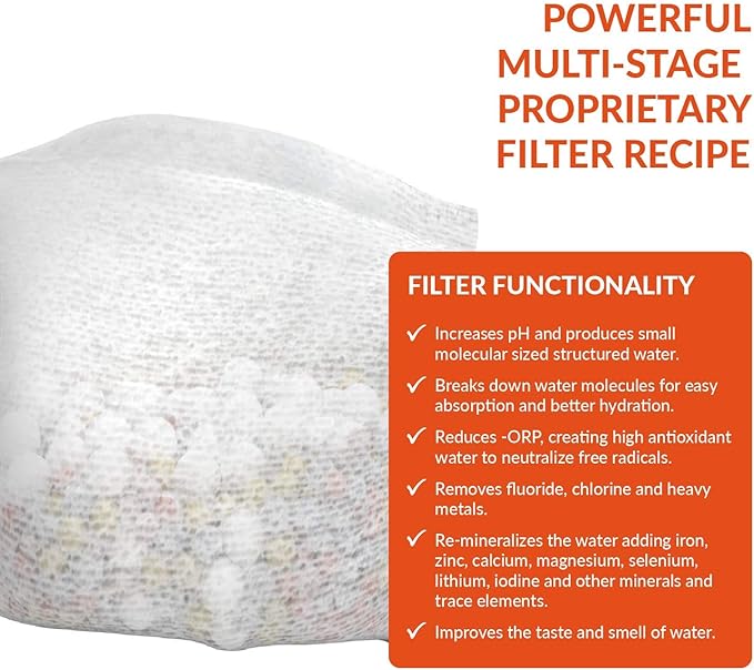- INCLUDES MULTI-STAGE ‘pH ON-THE-GO’ ALKALINE WATER FILTER (search B076H1MXP5) - increasing water pH and -ORP, improving taste and smell, adding minerals including zinc, magnesium, selenium & iron, eliminating heavy metals like arsenic, mercury, copper & lead, greatly reduce fluoride, chlorine & chloramine.