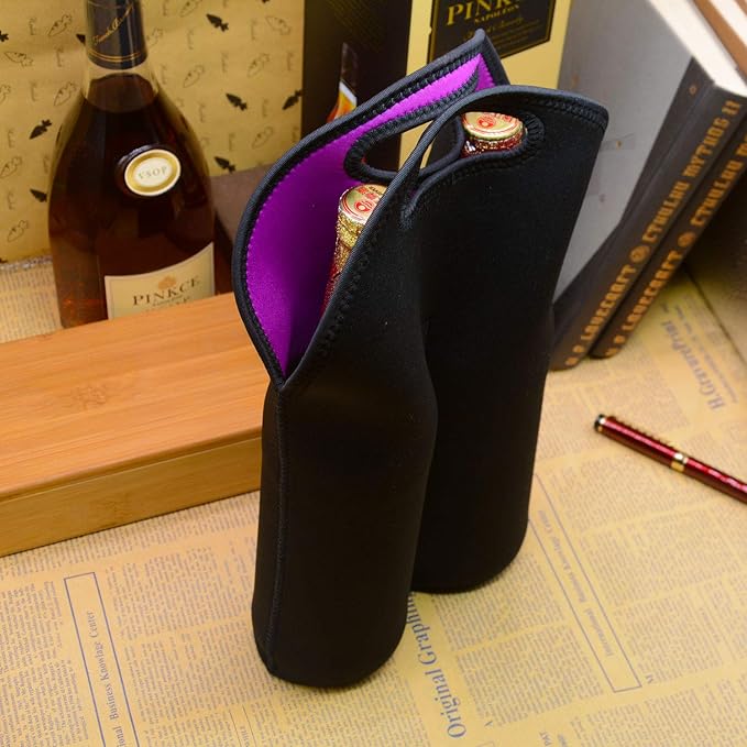 Two Bottles Wine Carrier Tote Bag, Insulated Thick Neoprene Wine/Water Bottle Holder Keeps Bottles Protected, Perfect for Picnics, Beach, Travel (2 PCS, Black)