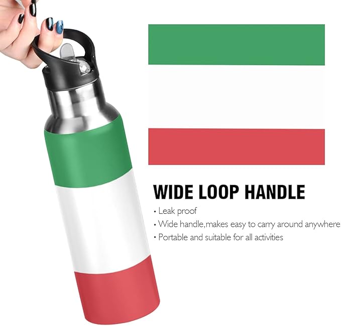 Italian Flag Sports Water Bottle, Double Wall Vacuum Insulated Stainless Steel Water Bottle with Straw Keeps Hot and Cold, Bike Running Sports Travel Gym 20oz