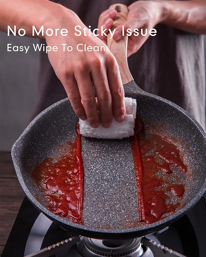 - -EASY TO CLEAN COOKWARE SETS- Thanks to the non-stick coating, cleaning the cookware set is effortless. Just use a soft sponge or dishcloth to wipe, and the oil stains will clear out easily. Please avoid sharp or pointy brushes as it may harm the non-stick layer.