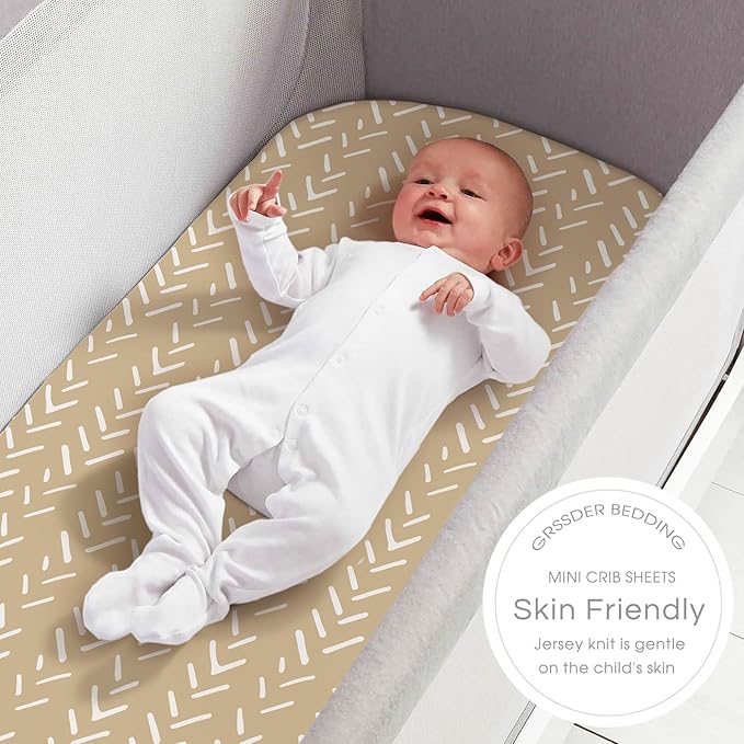 - Ultra Soft & 4-way Stretch: Made of 100% high quality soft stretchy jersey knit fabric. GRSSDER mini crib sheets offer a breathable, sweat-absorbent tee shirt like feel for exceptional comfort, providing your little ones a safe and to stay in place throughout the day.