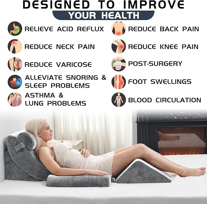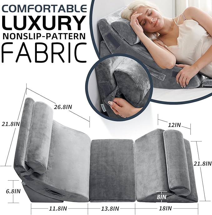 - THE NEWLY UPGRADED 6-PIECE WEDGE SYSTEM: The most advanced & developed wedge pillow set with a floor cushion and leg elevation pillows. Perfect for providing endless comfort for those who enjoy reading, watching, or relaxing in different places.