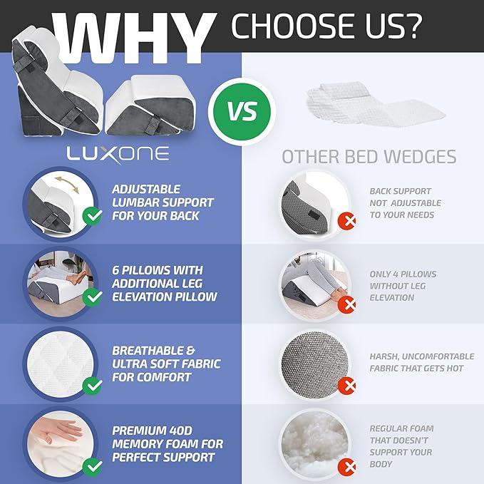 - Supreme Softness & Breathable Support - Unlike other bed wedges that feel stiff and unyielding, our 6-piece set features premium 40D memory foam. This advanced material cradles your body in softness while ensuring excellent breathability, so you stay cool and comfortable all night long. Plus, with the new adjustable back support, you can customize your comfort to suit your exact needs.