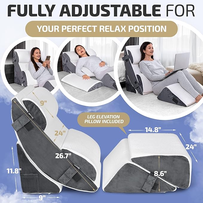 - Complete Body Support - This 6-piece set includes everything you need for total body support—from your head down to your legs. The adjustable backrest, leg, and knee elevation pillows make it easy to find your perfect pain-free position, whether you’re reading, watching TV, or recovering from surgery. It’s like having a fully customizable recliner, right in your bed.
