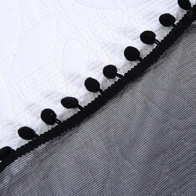 - Size detail:37.4" X 228" each curtain. This Black pom pom canopy scarf is suitable for all bed sizes.Pls check you bed or bed frame dimension before you buy.You could use for metal/wood bed frame , house bed,carrige bed.Put in baby nursery room,girls bedroom,boho/princess style room,etc.