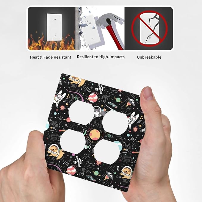 Space Cute Cat Dog Decorative 2 Gang Duplex Outlet Cover Wall Plate Double Switch Two for Electrical Kitchen Kids Boys Room Bedroom Bathroom Home Novelty Decorate