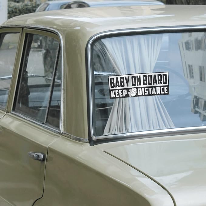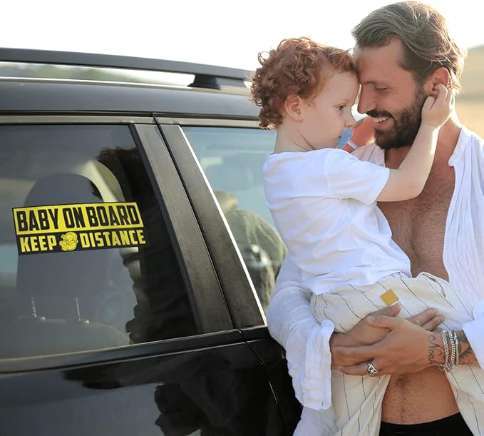 - BABY ON BOARD STICKERS - The waterproof and high-quality sticker has a strong adhesive that will not peel off your car window and is designed to withstand all weather conditions. Because it is applied to the outside of the vehicle, it can be used with tinted windows.