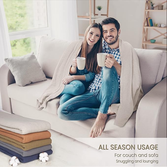 Lulu moon Muslin Blankets for Adults 55”x75” - Couch Throw Blanket for Boys - Light Weighted Muslin Quilt for Sofa and Bed (Ivory)