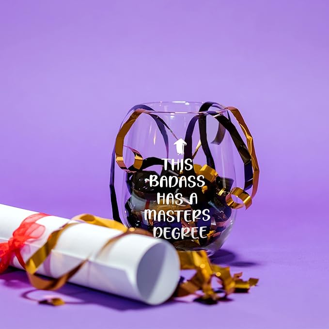 - PERFECT GIFT FOR MANY OCCASIONS: This Badass Has a Masters Degree stemless wine glass can be used as a graduation gift for your friends, girlfriends or graduates who are about to enter a new job. Perfect gift for encouragement, keep going gifts, support, motivational gift positive gift, birthday gift, etc.It would be an inspiring and warm gift.
