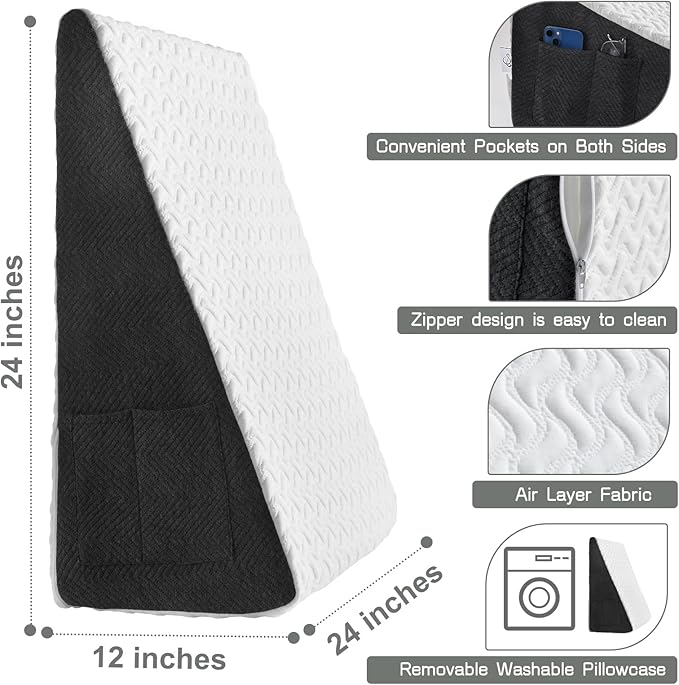 - Convenient Design: This wedge pillow features handy side pockets to keep your essentials like your phone, glasses, and remote controls within reach. The 7.5-inch model includes one pocket on each side, while the 12-inch model offers two pockets on each side for added convenience.