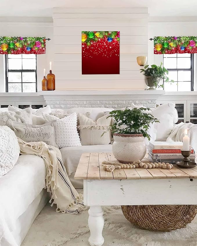 Vandarllin Christmas Balls Kitchen Curtains Valances for Windows Pine Tree Snowflakes Xmas Rod Pocket Window Treatment for Kitchen/Living Room/Bedroom/Bathroom,60" X 18" -1 Panel, Red
