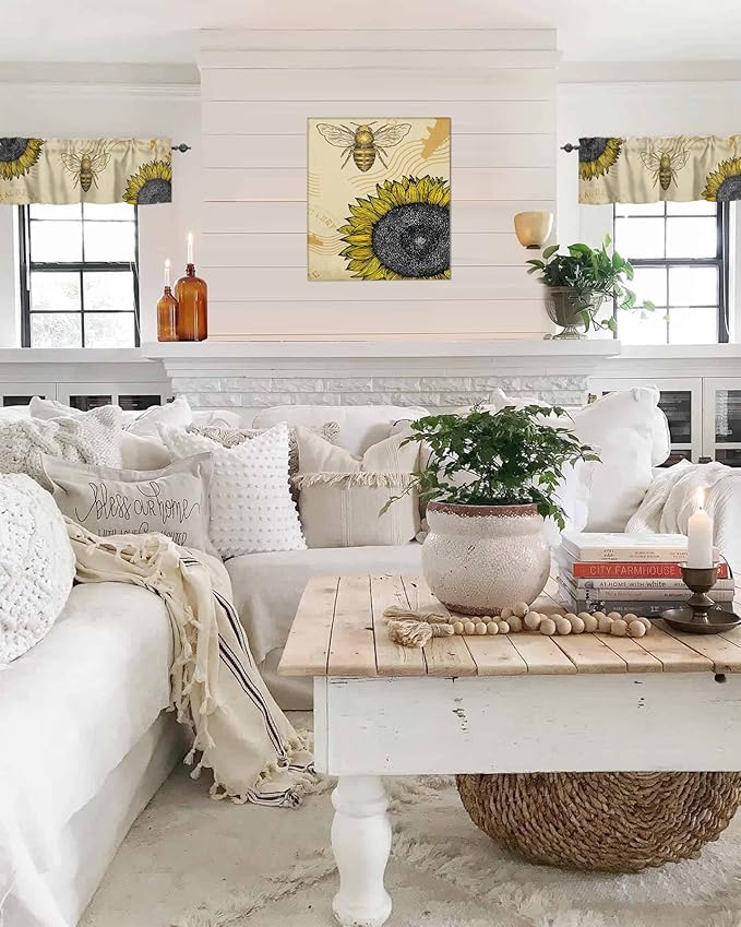 Vintage Sunflower Bee Kitchen Curtains Valances for Windows Summer Rod Pocket Window Treatment for Kitchen/Living Room/Bedroom/Bathroom,60" X 18" -1 Panel, Yellow