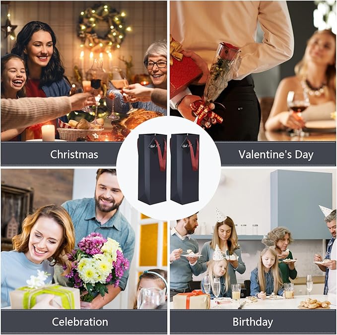 Wine Bags, 6 Packs, Strong Card Paper Wine Gift Bag with Ribbon Handles and Thank You Card, 4-3/8x 4 x 14" Fit 750ml Wine Bottle or Champagnes - Black 6