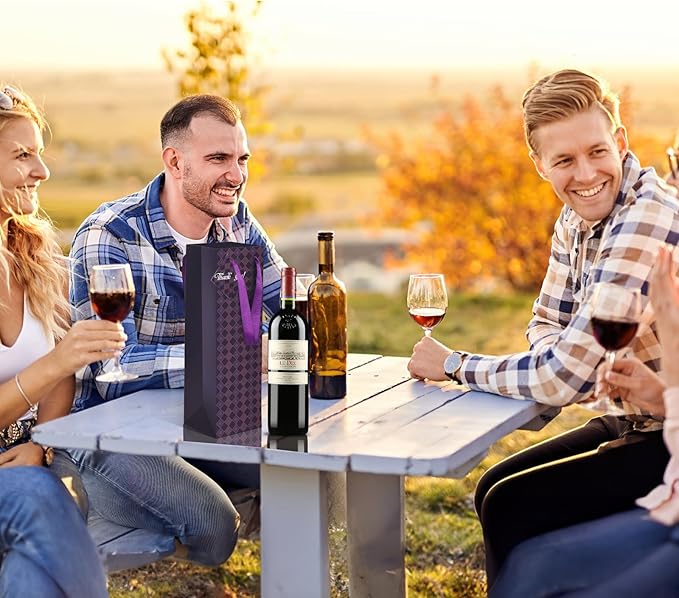 Wine Bags, 6 Packs, Strong Card Paper Wine Gift Bag with Ribbon Handles and Thank You Card, 4-3/8x 4 x 14 Fit 750ml Wine Bottle or Champagnes - Purple 6
