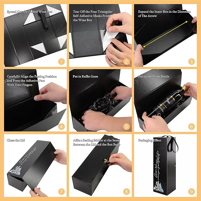 - 【ASSEMBLY】Folding Packaging Method. Simply open the gift box, peel off the white triangle sticker, assemble and glue to create a sophisticated gift box.