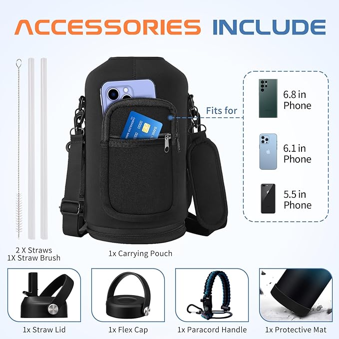 - HANDY STORAGE SLEEVE: The cross-body carrying case with a removable padded shoulder strap that can be adjusted from 25" to 50" to offer you more carrying options & hands free, 2 zipper pockets for storing your phone, card, keys, airpods, etc. The neoprene material storage pockets protect 1 gallon water bottle from slight bumps, keep the maximum temperature retention