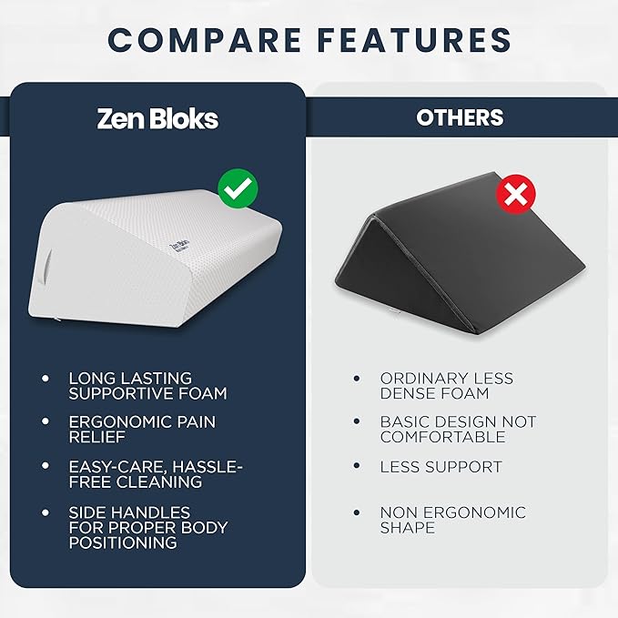 - Relax Around the Home or Clinic Use for Hours: High-Density Foam to withstand clinic use. Lightweight and versatile bolster, transport this bolster from your bed to the sofa or even a floor mat. With side handles, its lightweight (5.5 lbs) construction lets you quickly transport on road trips or around the home. Despite the initial investment, our ZenBloks leg elevatin wedge is engineered for exceptional longevity, designed to withstand daily use for hours on end. Approx .03 cents per day for the next decade of use.