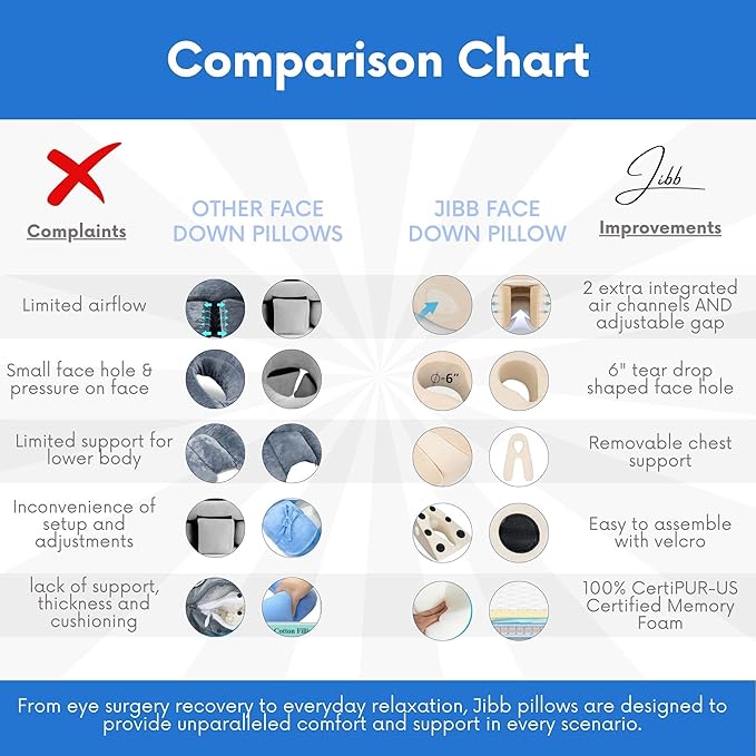 Jibb Deluxe Face Down Pillow for Stomach Sleeping or After Eye Surgery - Prone Pillow for Vitrectomy, Retinal Surgery or BBL - Massage Pillow with CertiPUR-US Certified Memory Foam Headrest.