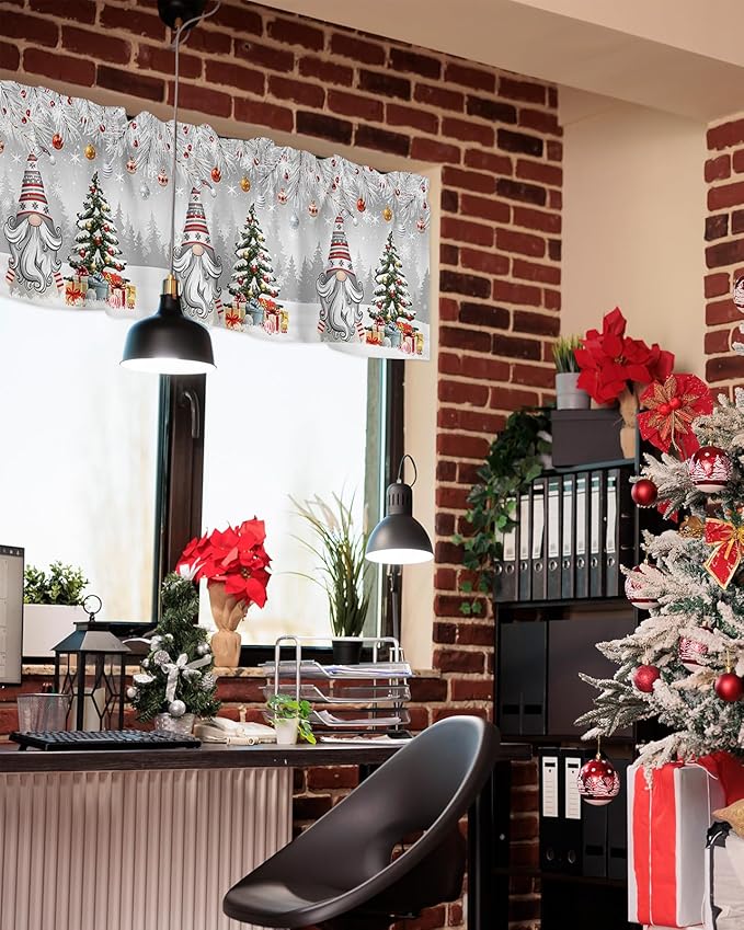 Christmas Gnome Valance Curtains for Kitchen Windows Winter Merry Christmas Tree Balls Rod Pocket Window Treatment Toppers for Kitchen/Living Room/Bedroom/Bathroom, 60" X 18", Grey