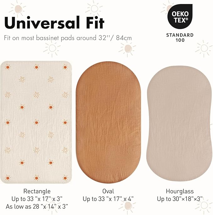 - ONE SIZE FITS ALL(33"X17"X4"): Our bassinet sheets flexible fit most bassinet's, lounger's, cradle's, co-sleeper's standard, oval, round, rectangle, hourglass shaped mattress. Snug fit with universal size featuring an elastic band, for easy fitting and removal of the crib sheet
