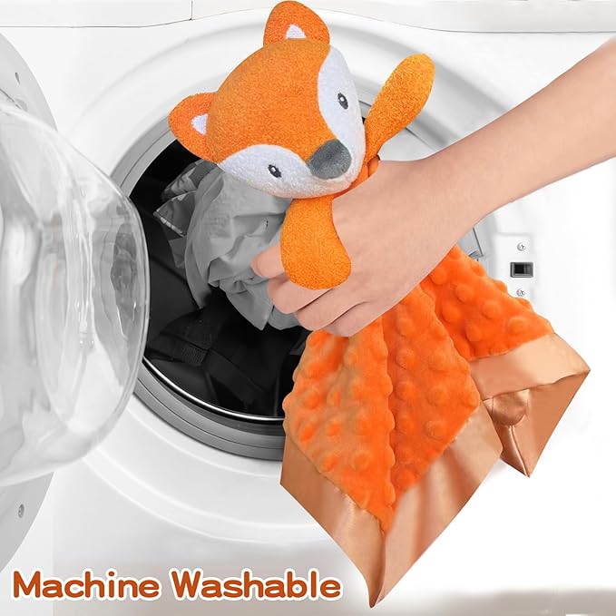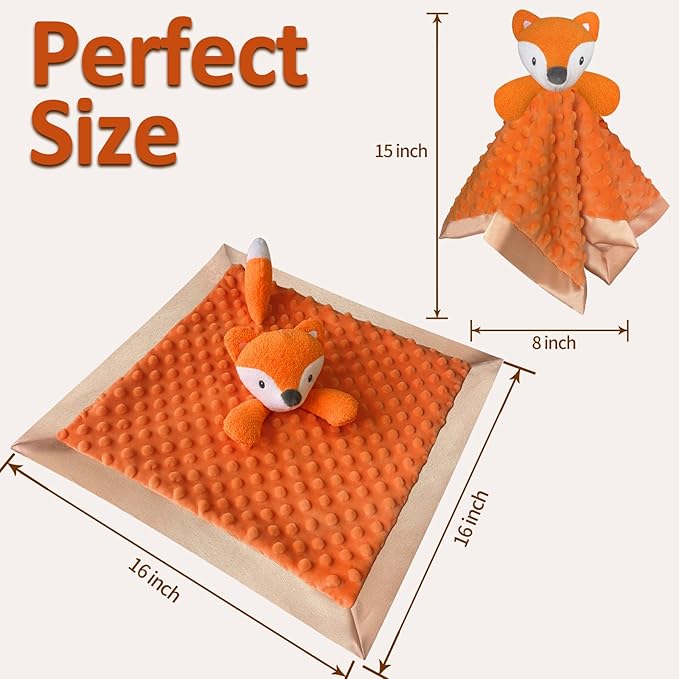 - 🦊【Premium Material】MOVEPAI makes the highest quality lovey blankets with safety and healthy in mind. Great attention to detail goes into the production of each lovey. Unique textured plush and satin fabric with its realistic colors and fun & friendly animal designs which provides more tactile sensation for babies and enhances their sense of security and exploration. 16''x16'' fox's features are embroidered, with no plastic filling, taking care of your baby's health.