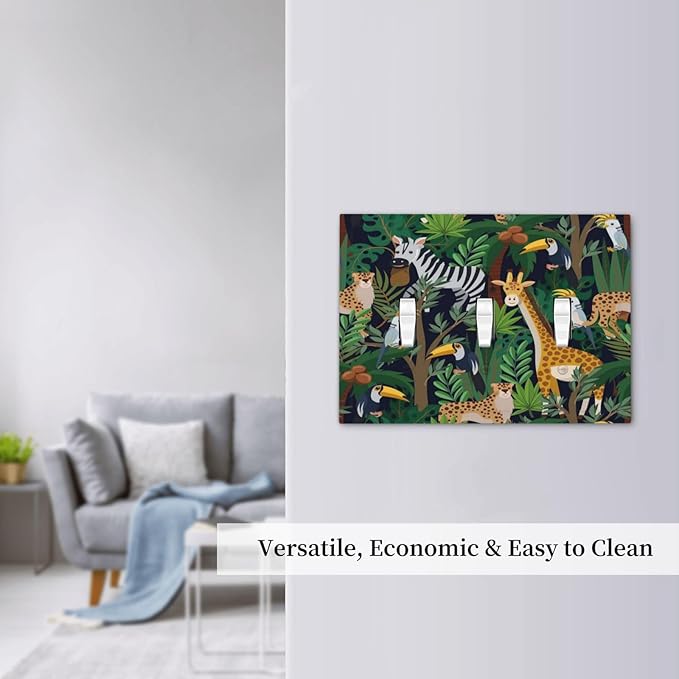 Cartoon Animal Zebra Leopard Giraffe Bird Leaf 3 Gang Nursery Light Switch Covers Decorative Triple Toggle Wall Plate Electrical Faceplate Switchplate for Kidroom Bedroom Decor