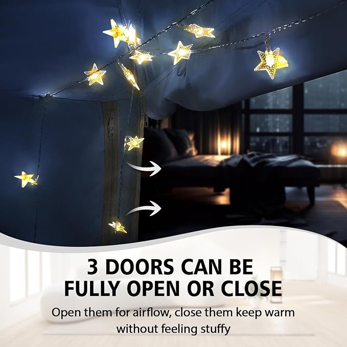 • Tent Light: The bed tent include a string star lights, transforming the bed tent into a music room, indoor castle, or camping-themed bedroom, adds a touch of magic to your sleep tent, providing them with a fun and private space of their own.