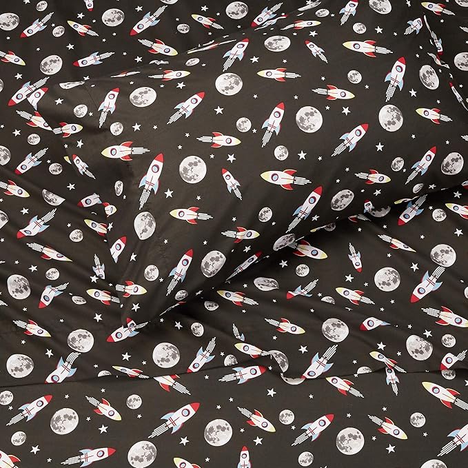 Amazon Basics Kid's Soft Easy-Wash Lightweight Microfiber 3-Piece Sheet Set, Toddler, Multi Colour, Space Rockets
