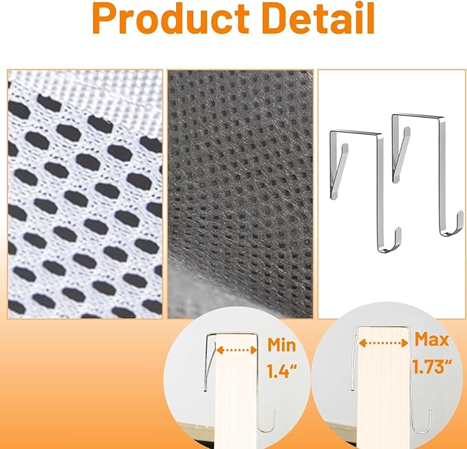 - 【2 Supporting Hooks &6 Mesh Side Pockets, Reliable and Convenient】 You can hook it on all the regular thick doors (1.4”~1.73”). It also have 6 mesh pockets on the side for small items like keys and combs or flip flops and frequently used stuffs, keep your essentials at your fingertips.