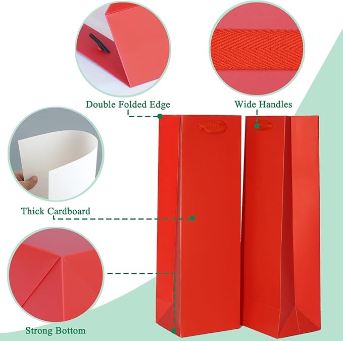 - 【Premium Quality】Wine gift bags with handles are made of thickened cardstock for a premium feel and durability. The widened handle ensures strong weight-bearing capacity, supporting up to 11 pounds (5 kilograms).