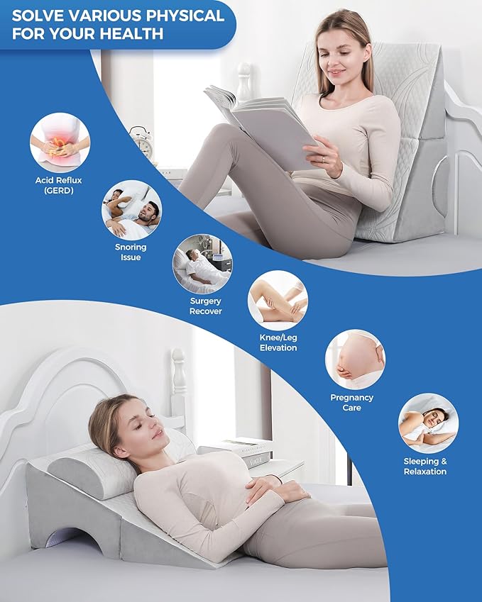 - 【FOLDABLE WEDGE PILLOW FOR VERSATILE USE】: The foldable wedge pillow has been designed with versatility in mind. You can customize its shape according to your comfort needs, and it comes with a headrest pillow for added support. It's not only great for sleeping, but also for reading and watching TV