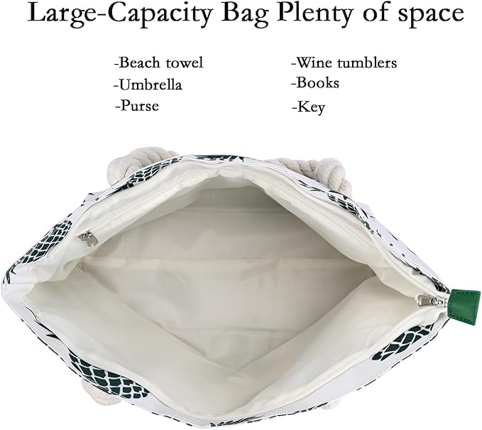 • LARGE BEACH BAG:Size at L16.54"xH13.39"xW5.5",Fully functional design with a stylish lined interior with side pockets, there is enough space to keep your lipsticks,cosmetics,beach towel,beach hat,flip flop,sunscreen and sunglasses,swimsuit and other necessities.
