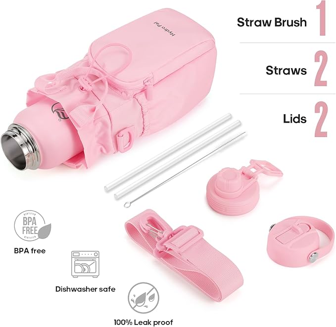 - COMPLETE ACCESSORY KIT: Includes a high-quality insulated water bottle, a waterproof holder with strap, straw lid, spout lid, two straws, & a straw brush
