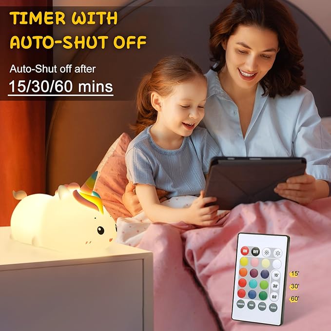 - 🦄 【Adjustable Brightness & Convenient Timer】 Rather than the generic 3-level, you can customize the 6-level illumination to suit your needs with our unicorn night lamp adjustable brightness feature. Whether it's a soft, subtle glow for bedtime stories or a brighter light for nighttime tasks, our night light adapts effortlessly. Plus, the convenient 15/30/60mins timer function of the night light lamp offers you 3 set choices, ensuring hassle-free operation with one key setting on remote controller, automatically shutting off after a set period for added convenience. These two designs are both upgraded specifically for the use of a baby night light or nursery night light.