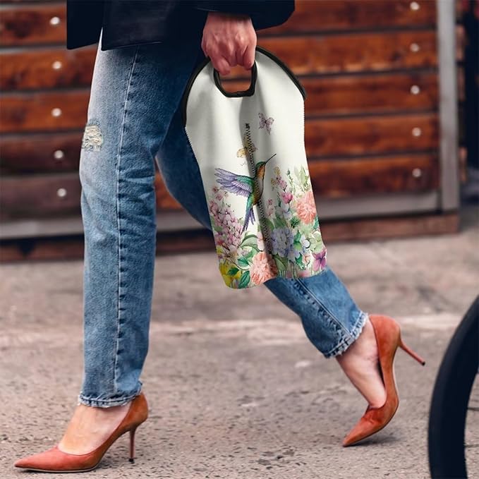 doginthehole Neoprene Wine Tote Hummingbird Wine Carrier Bag with Divider for Travel, Portable Wine Gift Bag Insulated Sleeve Champagne Carrier Bag