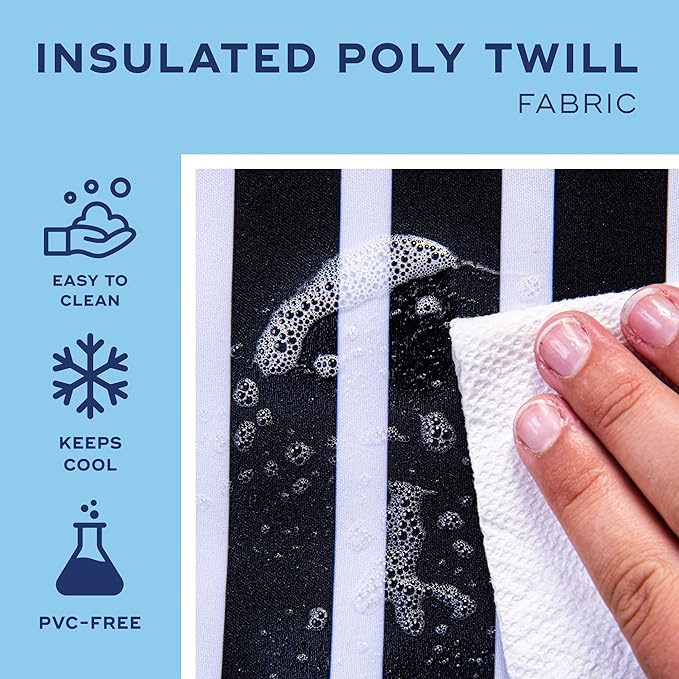 - INSULATED POLY TWILL has a water-resistant exterior, foam-insulated middle, and a heat-sealed, food-safe liner inside (PVC-free) that won’t leak. Add wine and go!
