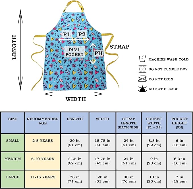 - THREE SIZES FITS KIDS 2-15 YEARS – (Small - 2 to 5 years, Medium – 6 to 10 years and Large - 11 to 15 years). For details about size, refer to the images. Apron features (1) Adjustable neck buckle/strap makes it easy to put on and take off the apron. It also accommodates the needs of a rapidly growing child. (2) Long and sturdy waist tie aids a perfect fit. (3) Dual front pocket provides plenty of room for small tool / tools, accessories, art / craft supplies and keeps hands free.