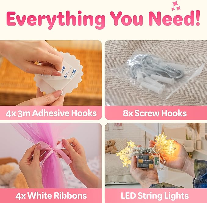 - Additional LED Lights And Pink Ribbons Included: Customize the look with additional LED lights and four pink ribbons that can be hung or removed as desired. Create a cozy, magical ambiance with this pink bed canopy with lights or purple bed canopy, perfect for a canopy for a princess.