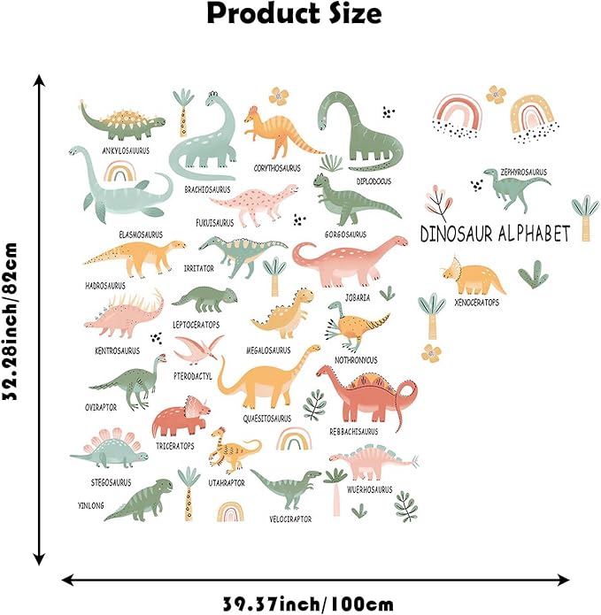 - 🦖【Stylish Pattern】Dinosaur wall decals, Dinosaur stickers print art and modern design into an eye-catching mural. This sticker is very suitable for nursery,bedroom,playroom,living room,children's rooms.