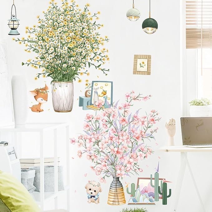 - 🌺【Stylish Pattern】Pink Flowers Potted wall decals, cartoon dog deer print art and modern design into an eye-catching mural. This sticker is very suitable for nursery, bedroom, playroom, living room, adorable kids room decor.