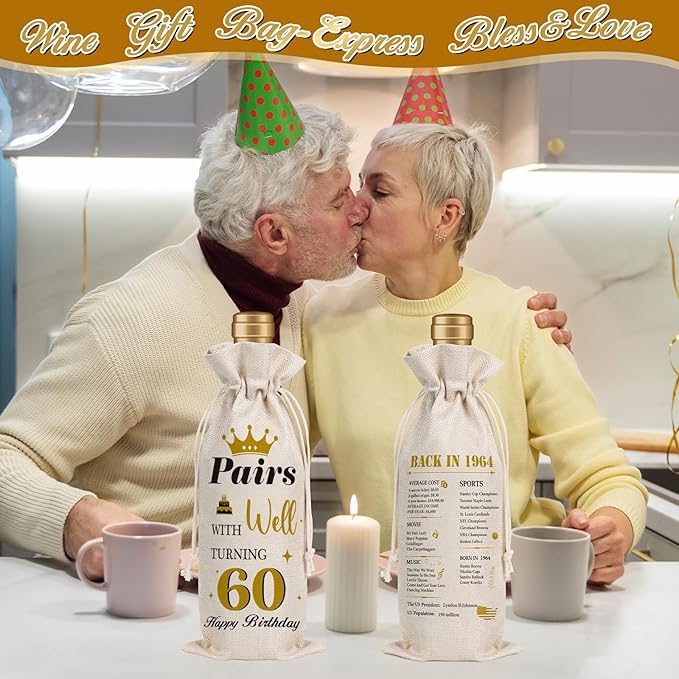 - 【Retro Birthday Party Decoration】Our 60th birthday wine gift bag can take you back to life 60 years ago, including 1964 pop music, movies, country population, prices and famous singers and actors born in the same year, perfect for her /Perfect gift for his 60th birthday party.