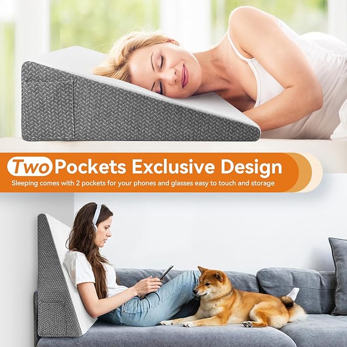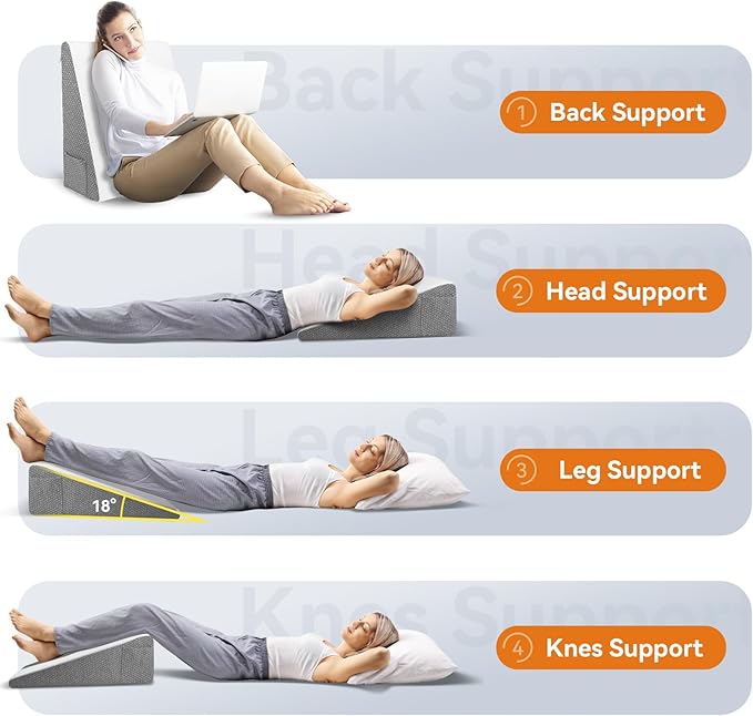 - [ Ergonomic Designed ] - Ergonomic pillow design helps to pain relief. Wedge pillow to elevate knee stands ready to alleviate discomfort and improve your overall well-being, providing a comprehensive solution for your health needs. This pillow wedge for sitting up in bed could address diverse body pains, from post-abdominal surgery and digestive issues, neck, back, and shoulder pain, knee discomfort, leg swelling, and even pregnancy care.