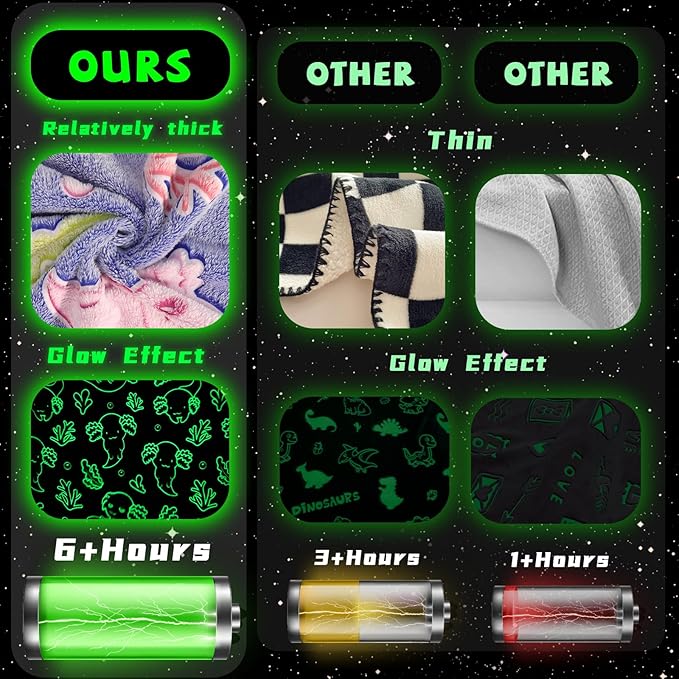 - Glow in the Dark Blanket for Girls - Cute blanket is made of soft fabric, cozy, warm, and breathable. Plush axolotl blanket for girls can glow in dark. just expose it to a bright light source or sunlight for about 15-20 minutes. The brighter the light, the stronger this glow in the dark blanket axolotl will shine in the dark.