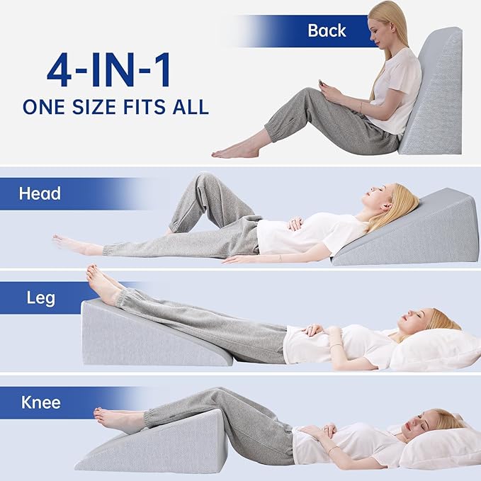 - 4-IN-1 USAGE DESIGN: Our wedge pillow is designed to offer superior comfort and support for all your relaxation needs. Whether you're reading, watching TV, or sleeping, our 4-in-1 bed wedge pillow can be adjusted to support your back, head, legs, or knees. Our versatile bed wedge provides a customizable experience to suit your every need.