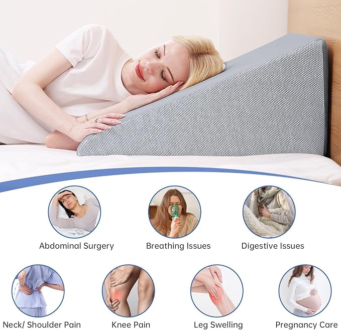 - ERGONOMICALLY DESIGNED: Our wedge pillow for sleeping is designed with a desirable 30° angle that provides great elevation for maximum comfort and support. Our ergonomic design helps alleviate a wide range of issues such as abdominal surgery, breathing issues, digestive issues, neck/shoulder pain, knee pain, leg swelling, and pregnancy care.